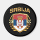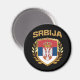 The national flag of Serbia is infused into a faux gold shield shape which itself, rest upon faux gold laurel leaves, The name of the country is added above the image.