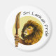 Watercolor illustration of a Sri Lankan flag's lion with a flowing mane, depicted holding a stylised sword. The lion’s expression is focused, with detailed facial features. The sword has a curved blade with intricate designs and a prominent grip. A yellow circular background highlights the figure, enhancing its regal and emblematic appearance.