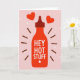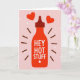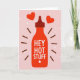 This card grabs your attention right away with a stylized bottle of fiery red hot sauce on a soft, pink background. It's all about love and affection, with two red hearts floating above it. The bottle boldly says "HEY HOT STUFF" in white letters, with a tiny flame below adding to the passion. Around the bottle, there are brown lines, white asterisks, and dots, like confetti, giving a lively vibe.