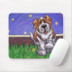 Animal Parade Cute St. Bernard Dog Mouse Pad created by Imagine That! Design features our cute tan and white dog character standing in a grassy yard with a red brick fence, a textured blue sky and a playful wavy purple border painted by our talented children's book artist, Traci Van Wagoner. The fun pup stands in play position with one paw raised. This fun pet art is perfect for St. Bernard dog lovers and humourous animal art lovers of all ages. On many of our whimsical St. Bernard doggy products you'll find this cute puppy coming and going with the playful Saint Bernard dog's head on one side and the funny dog's tail on the other. Join the Animal Parade and bring a smile to the face of someone you love with a gift of our cute St. Bernard dog. Woof!