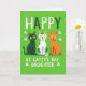 This card features three stylised cats lined up front and centre on a bright lime green background, giving the whole scene a festive St. Patrick’s Day look 💚. One cat is emerald green, the next is white with green shamrock-like spots, and the third is a ginger tabby, all sitting neatly side by side as if posing together. Their yellow eyes and tiny pink noses add a teasing charm, and the little white fangs peeking out make them look like they’re sharing an inside joke with the viewer. The cats’ steady, front-facing gaze feels like a friendly nudge meant just for a daughter, with the trio’s close spacing suggesting a cosy, affectionate bond. Across the top, “HAPPY” is set in alternating dark green and white letters, spaced evenly above their heads. Along the bottom, “ST. CATTY’S DAY DAUGHTER” appears in large white text, centred and easy to read, with small white shamrocks floating around it ☘️. The background stays a solid lime green while the cats and lettering are outlined in thin black lines, and the white shamrocks dot the space like confetti.