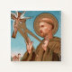 One of the epithets of St. Francis of Assisi (1181-1226) is Pater Seraphicus. In 1224, while meditating on Mt. Alvernia in the Apennines on Christ’s Passion, St. Francis had a vision. He beheld a seraph, a six-winged angel of the highest order, on a cross. In response to his prayer to more closely imitate Christ, the angel gifted St. Francis with the stigmata, the wounds in the wrists and feet from nails and in the side from a lance that were inflicted on Jesus. The wounds bled on and off until his death two years later. + This figure of St. Francis derives from Hippolyte Flandrin’s rendition of the saint in the Church of Saint Vincent de Paul in Paris. Between 1848 and 1853, Flandrin painted 160 saints against a patterned gold ground in procession in two files converging on the altar--males on the right, females and families on the left. St. Francis is grouped with the founders of religious orders. The landscape here appears only in the devotional print. The church in the background is San Damiano, the church St. Francis was commissioned by Christ to rebuild in an earlier vision that metaphorically stood for reforming the Church at large. + Feasts: September 17 (Stigmata of St. Francis of Assisi); October 4 (Life of St. Francis himself) + Image Credit (SAU 040): Antique image in chromolithography of San Francisco De Asís [St. Francis of Assisi], probably originally published in an unnumbered Franciscan series by the Socièté de St. Augustin, Bruges, Belgium, late 19th century, from the designer’s private collection of religious ephemera.