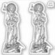 The figure on these stickers was extracted from a black and white 1889 litho. The litho's publication coincided with the promulgation of a “Prayer to St. Joseph” authored by Pope Leo XIII. It was included in his encyclical known from its opening words in Latin as “Quamquam Pluries”, that is, “Although Many Times…” about devotion to that saint. + The litho from which this figure was extracted was compositionally much more complex. (See the cards and posters in this COLLECTION.) Suffice it to say, here St. Joseph is portrayed in his role as protector of The Church stamping out Satan. As per usual, St. Joseph holds a spray of lilies symbolising purity in his right hand and an L-shaped carpenter’s rule indicative of his profession in his left. In addition to these traditional attributes, however, several others appear--most notably: a small dragon, a crown, a scroll, and a globe inscribed with the names of the populated continents—Asia, Australia, (North and South) America, Africa, and Europe. The dragon, of course, stands in for Satan. The scroll reads: “Non serviam”, that is, “I will not serve”, a phrase that sums up Satan’s rejection of God. (In some press runs, the word ‘Liberalism’ appears too below Satan’s words.) The towering figure of St. Joseph, much larger and grander than the dragon, tramples out Satan’s power over the world by crushing the dragon beneath his feet and toppling the crown from the dragon’s head thus ending Satan’s dominion over humankind. + Principal Feast of St. Joseph: March 19; Feast of St. Joseph the Worker: May 1 + Image Credit (DT 01): Figure extracted from an antique lithograph of Sancte Joseph, Patronus Ecclesiae [Saint Joseph, Patron of the Church], originally published by Desclée, Lefebvre et Cie, Tournai, Belgium, 1889, from the designer’s private collection of religious ephemera.