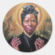 This is a detail of a captivating painting of St. Josephine Bakhita by Akaninyene Ubuo. St. Josephine Bakhita was born in the Darfur Region of Sudan around 1869. In 1877 she was kidnapped by Arab slave traders and endured horrific suffering. She had to walk barefoot over 600 miles after her kidnapping, and was bought and sold at least 12 times. Once the wife of her owner (a Turkish General) intentionally scarred her in patterns with a razor and salt. She carried these 114 scars to her grave. After spending some time with the Canossian sisters of Venice, she refused to leave with her current mistress, and demanded to stay with the Sisters. This led to court case which declared her free, as slavery was illegal in Sudan before her capture. She discerned a call from God to join the Canossian sisters, and took her final vows with the Canossian Daughters of Charity religious order on December 8, 1896. She was eventually assigned to a convent in Schio, Vicenza. For the next 42 years she worked as a cook and a doorkeeper. She was known for her smile and gentle nature. I commissioned an artist to paint this exclusively for this Zazzle store, as I admire St. Josephine for her joy despite her suffering. I learned about her life by watching a movie called "Bakhita:from Slave to Saint" which inspired me to learn more about her. Her raised hands reveal the scars on her right arm, and at the same time indicate prayer, gratitude, and freedom. St. Josephine Bakhita, pray for us that we might find freedom in Jesus Christ. She is the patron Saint of Sudan, as well as human trafficking victims.