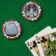 A poker chip featuring two photos taken in St. Louis, Mo. The Arch and the courthouse.