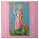 According to tradition, St. Margaret (or St. Marina the Great Martyr) laid down her life for Christ during Diocletian’s persecution at the beginning of the fourth century. Though a famous virgin martyr, ironically she is patron saint of expectant mothers and women in labour. The devil in the guise of a dragon, as this unusual patronage’s origin story goes, swallowed her whole. However, the cross she was carrying so irritated the dragon’s innards that he either egested her or ruptured to be rid of her. While even Mediaeval popes and hagiographers deemed this story fanciful, nevertheless, it was embraced by the laity and by artists if only for its symbolism. And, the cross and the dragon have been her principal attributes ever since. + This image of St. Margaret is particularly fetching. The saint, whose beauty was legendary, stands on the back of a large green dragon that tugs at her cloak with its teeth. She is crowned with a garland of roses, her long blonde hair flowing over her shoulders. She wears a bright pink mantle over a white tunic against a blue background patterned with little white dots and stars. + This product line emphasizes St. Margaret’s patronage of pregnancy and childbirth. The dominant pink and blue colour scheme ties in well with the modern custom of using these colours for girl and boy babies. The mantle’s golden yellow lining allows for a gender-neutral theme. + Feast: July 20 +