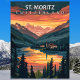 Celebrate the glamour and heritage of the world's oldest ski resort with this St. Moritz Travel Postcard. This vintage-style illustration captures the high-altitude elegance of the Engadine, featuring the sun-drenched slopes and the iconic frozen Lake St. Moritz, famous for its 'White Turf' horse races.