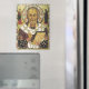 St. Nicholas "Lipensky" (Russian icon from Lipnya Church of St. Nicholas in Novgorod). Saint Nicholas is a popular subject portrayed on Eastern Orthodox icons, particularly Russian and Serbian ones. He is depicted as an Orthodox bishop, wearing the omophorion and holding a Gospel Book. Sometimes he is depicted wearing the Eastern Orthodox mitre, sometimes he is bareheaded. Iconographically, Nicholas is depicted as an elderly man with a short, full, white, fluffy beard and balding head.