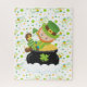 Sweet and festive design, a cute cartoon leprechaun lays perched upon a black pot of gold against a background of multi coloured shamrocks.