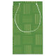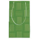 This gift bag has a mid-century modern design that looks like a weave with green lines on a field of darker green.
