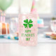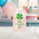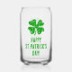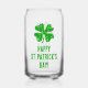 St Patrick's Day beer can glass with vintage lucky 4 leaf clover. Cool drinking glass with custom text. Personalise with name or funny quote. Irish pride green shamrock logo. Unique drinking glasses for party or event.