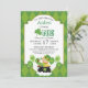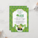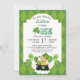 St. Patrick's Day Irish theme birthday party invitation for boy or girl. Invite features green diamond pattern, St Patrick's day leprechaun lounging on pot of gold, and shamrock balloons. Easy to personalise with custom options.