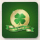 St. Patrick's Day illustration featuring a golden coin with shamrock and a ribbon displays "Happy St. Patrick's Day" in modern bold gold letters on an elegant green background.