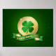 St. Patrick's Day illustration featuring a golden coin with shamrock and a ribbon displays "Happy St. Patrick's Day" in modern bold gold letters on an elegant green background.