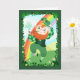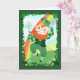 A lucky Leprechaun dances a jig on the Irish hills at end of the rainbow. Original illustration by Noël Snow.