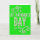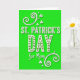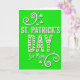 This card features an emerald green background with a centered St. Patrick’s Day message arranged in three stacked lines: “ST. PATRICK’S” on top, “DAY” in the middle, and “for Mom” at the bottom 💚. “ST. PATRICK’S” appears in white letters filled with tiny green shamrocks and small star-like dots, giving the top line a sprinkled texture. The word “DAY” is the largest, set in white and packed with a tight pattern of dark green three-leaf clovers that makes it look richly detailed. “for Mom” sits just below in a smooth, flowing white style that softens the layout, like a gentle sign-off to someone you’re close to. White curling flourishes with thin green accents frame the top and bottom edges, wrapping the message the way a warm hug might. Several white shamrocks float around the text at different sizes, adding little pauses for the eye and a light, friendly charm ☘️. A faint shadow under the white lettering and decorations helps them stand out against the green, while the corners remain filled with scattered shamrocks and curving white lines.