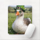 A goose, sporting a small St. Patrick's Day hat with a four-leaf clover and glasses, stands in a grassy field beneath a clear sky