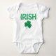 St Patricks Day baby bodysuits with green faux glitter text and shamrock printed on white background