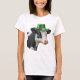 T-shirt for St. Patrick's Day or anytime you want to display your Irish pride featuring a watercolor image of a black and white cow wearing a kelly green top hat with gold band, a white daily and shamrocks on front of hat. Additional styles available. Image may need to be adjusted for varying sizes.