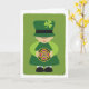Cheerful leprechaun with Celtic knot and hat. Modern illustration with a touch of whimsy that is sure to bring a smile. Solid, saturated, hand-painted look. Green, purple, red, blue, gold, white and black. Inside: Lá Fhéile Pádraig sona duit! (“Happy Day of the Festival of Patrick to you!”)
