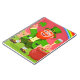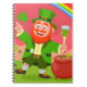 A cheerful and vibrant 2D cartoon illustration featuring a happy leprechaun celebrating St. Patrick's Day. The character is dressed in a classic green suit and top hat with a gold buckle, sporting a bright red beard. He holds a four-leaf clover in one hand and a green drink in the other, standing next to a red pot filled with gold coins. The scene is set in a green meadow dotted with shamrocks under a pink sky and a bright rainbow.