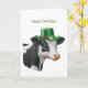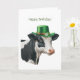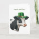 Birthday greeting card featuring a watercolor illustration of a black and white cow adorned in a green top hat with a gold band and a white flower and shamrocks. Happy Brithday greeting on the front. Inside features the greetings - Hope your day is udderly fantastic. Happy Brithday!