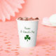Happy St. Patrick's Day party paper cup, with a cute green shamrock design on a white background. With green script typography lettering, you can customize with your own text. Great for your St. Patrick's Day party celebration.