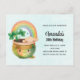 Birthday invitation with an adorable illustration featuring a smiling green and gold pot with a cute rainbow,