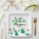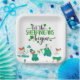 Let the shenanigans begin saying in script typography, St. Patrick's Day party paper plates featuring dancing party goers in green with shamrocks.