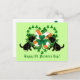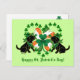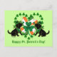 St. Patrick's Day Two Black Labradors Postcard for Labrador Fans! Unique and funny Labrador Retriever Cartoon Design created by Naomi Ochiai from Japan. Adorable Black Labrador celebrating Happy St. Patrick's Day wearing Leprechaun Irish Green Hat and Green Scarf with Shamrock in his mouth.