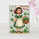 This card shows a sweet, cherubic young girl centered on a softly textured light grey‑green background, with small shamrocks scattered around her like confetti ☘️. Gentle, diffused light picks up her rosy cheeks and the tender, welcoming look in her wide brown eyes, as if she’s greeting a close friend. She wears a deep forest‑green dress with puffed sleeves, a crisp white Peter Pan collar, and a lightly ruffled apron that adds a cozy, old‑fashioned touch 💚. Bright red ribbons form neat bows in her curly dark hair and at her neck, giving a warm contrast to all the green. In one arm she carries a woven basket overflowing with four‑leaf shamrocks, and in her left hand she holds a single sprig forward like a small offering. The lettering sits across the top, with a large “A” in the upper left and the phrase “St. Patrick’s Day Message” in red on the upper right. The top text is balanced above her head, while the floating shamrocks dot the space around her dress and basket.