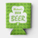 Enjoy a nice Irish beer this Saint Patrick's Day with this cool, personalised beer can foam cooler. It says, "[Your Name] Irish Beer." The word "beer" looks like green bubbles. A white shamrock fills the centre, and the background has a green clover pattern. Top off the mornin' with a beer in this custom can cooler.