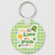 This festive holiday keychain features text image "May the luck of the Irish be with you" with Irish hat, coin and shamrocks on a green plaid background.