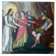 On May 24–25, 1802, in the Catacomb of St. Priscilla on the Via Salaria of Rome, human remains were discovered in a tomb sealed with three tiles. The tiles were decorated with palms, arrows, anchors, and an ivy leaf and bore the inscription when properly rearranged: ‘Pax Tecum Filumena’, that is, ‘Peace be with you, Philomena’. + According to apparitions of the saint herself, St. Philomena (c. 291-c. 304) was a young Greek consecrated virgin who suffered martyrdom during the reign of Diocletian. Having rejected the Roman Emperor for love of Christ, she was subjected to a series of tortures (such as flogging) and attempts on her life (being shot with arrows and drowned with an anchor tied to her neck). When these attempts failed to kill her, she was finally beheaded. + This ceramic tile's image is from a mid 19th-century lithograph used as a plate in an unidentified book and depicts St. Philomena at trial before the Emperor. + Canonised by Pope Gregory XVI but never enrolled in the Roman Martyrology, St. Philomena’s Church-approved cultus was suppressed in 1961 despite her having been venerated for more than 150 years and by a number of people who themselves became saints no less—St. John Vianney and St. Damien of Molokai to cite but two. (Why? It’s a long story—too long to go into here.) Nevertheless, the beloved little saint still enjoys widespread private veneration by the laity. + St. Philomena is patron saint of babies, children, and young people. Known as a ‘Wonder Worker (Thaumaturga)’, she is invoked in desperate cases and lost causes. “To Philomena, nothing is refused.” + Feast: August 11 + Image Credit (#1 of 4): Saint Philomena before Deocletian (sic), Adrien-Népomucène Dembour (1799-1887) and Charles-Nicolas-Auguste Gangel (1798-1860), Printers, Metz, France, 1840/1852, Metz Media Libraries, FIE IPO 008, Document placed under Etalab Open License. Public domain.