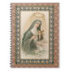 Wife, Mother, Widow, Nun—St. Rita of Cascia (1386-1457) experienced many stages of life. Life, however, had a way of putting her between a rock and a hard place. For this reason, she is venerated as patron saint of lost and impossible causes. Devoted to Christ’s Passion, she received a partial stigmata at the age of sixty: a chronic wound in the forehead as if from a crown of thorns that bled for the next fifteen years. It is her principal attribute. + Feast: May 22 + Image Source (M 015): Antique image of St. Rita [of Cascia] from a 1904 devotional print in chromolithography originally published by A. & M. B. [Albrecht & Meister of Berlin], Germany. From the designer’s collection of religious ephemera. + Frame and pattern: Adaptations of a border on a 19th-century devotional print. From the designer’s collection of religious ephemera. + Prefer a different colour scheme? The Colour Palette postcard for this image provides suggested coordinating hues. Colour Palette postcards are found in an image's associated COLLECTION and in the Special COLLECTION devoted just to colour palettes.