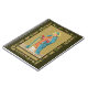 In this full-length portrait from a late 19th-century devotional print, St. Thomas Becket is depicted true to his earliest type: He is depicted in his prime: tall, slim, and clean-shaven. He holds his archiepiscopal cross in his right hand and carries a lectionary or Gospel book in his left. He is garbed in nearly full canonicals, that is, he wears a red dalmatic over a white tunic accessorised with red-violet gloves and a bright blue mitre. Presumably, he is also wearing on his feet that just peek out from beneath his robe buskins (ceremonial silk stockings) over his episcopal sandals (low shoes resembling slippers or modern loafers). He lacks only the requisite pectoral cross and ring. (The omission of a ring is a common artistic oversight.) A bright blue cope with yellow-green lining completes the ensemble. And, then, there is the unusually placed sword which pierces his mitered head from side to side…. + Throughout much of history, the sword has been the primary defensive and offensive weapon. Many saints—both male and female--have swords as attributes. In one two-volume iconographical study of some 1000 saints, a sword is associated with more than 15% or 150 of them! The sword is such a prevalent attribute that its presence alone is usually insufficient for pinpointing a given saint’s identity. + Context helps. Some saints, such as royal saints, carry a sword as a symbol of secular power. Other saints, soldier-saints, wield swords as a symbol of their profession. On rare occasions, some saints even carry two or three swords with varying significance attached. But, mostly, saints with swords are red martyrs, that is, saints who died for the Faith. + Most commonly, the sword signifies death by beheading. In narrative art, the execution itself may be portrayed. In single figure compositions, the Saint usually holds an unsheathed blade at his or her side point downward or shouldered point upward. The sword’s placement depends on whether the figure in question is full-length and standing or half-length as in a headshot. In more graphic renditions, the sword may be lodged in the head medially, wedged at the back of the neck, run through the throat, or piercing the heart or another of the body’s parts. + St. Thomas Becket’s martyrdom by four sword-wielding assassins began to be portrayed shortly after his death (See M 030). The indoor setting at an altar, the number of assassins with their respective heraldic bearings, and the presence of his cross-bearer are sufficient to differentiate Becket’s martyrdom from that of most other saints. The rare depictions of his decraniation leave little room for doubt of who is being portrayed. Less distinctive, however, were Becket’s first “portraits”. Of little interest iconographically, such representations routinely depict him merely as archbishop with no other emblems, identification being made through accompanying inscriptions. Gradually, Becket’s portraits were provided with a sword (See M 033) and head wounds (K 34). The same study mentioned in the first paragraph lists some 35 saints who were bishops or archbishops associated with a sword. Only one--with the possible exception of the lesser-known St. Theodard of Maastrict--however, is depicted mitered with a sword running through his head from side to side: St. Thomas Becket. It is by far and away the most popular way to represent the Saint today. + St. Thomas Becket is patron of secular clergy. + Feast: December 29 + Image Credit (P 005): Antique image of St. Thomas Becket from a late 19th-century devotional print in chromoxylography, originally published by Friedrich Pustet, Regensburg, New York, and Cincinnati. From the designer’s private collection of religious ephemera.