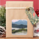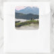 Souvenir photo sticker with the church of St. Thomas (Sveti Tomaž) on a hill surrounded by morning fog in the countryside of Slovenia near Skofja Loka during a pink sunrise with Alps mountains in the background.