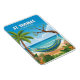 A striped hammock hangs from a palm tree branch over a sandy beach with the ocean and sky in the background.