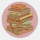 Stack of books with covers in pastel shades of orange, lilac, green and pink.