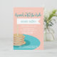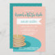 Cute pancake bridal shower invitation with a stack of pancakes on a turquoise plate.