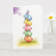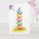 This design shows a vertical stack of five stylized rabbits 🐰, drawn with soft rounded shapes and simple features that make them look gently curious. From the bottom up, the colors move from orange standing on a small patch of green grass, to light green, pink, yellow, and a calm blue bunny balancing at the top. Their big dark eyes and tiny noses seem to glance toward one another, like close friends sharing a quiet, affectionate moment. The background stays white and open, giving the pastel colors plenty of space to stand out. In the upper left, there’s a faint purple cloud-like wash that adds a dreamy touch without taking attention from the rabbits. Any greeting text would sit neatly above the stack in a light purple tone, with a smaller line placed below in soft gray for balance 🌷. The orange bunny at the base is grounded by a thin strip of grass with a few short blades pointing upward.