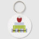 Great teacher's key chain, with graphic artwork of a stack of colourful books, with an apple on top, against a blue and white polka dot background. Personalise the black text with your teacher's name. Perfect little gift for that special teacher.