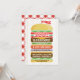 Unique Stacked Hamburger with onions, pickle, lettuce, hot dog, cheese, mustard, ketchup, on a white woodgrain background. A gingham red picnic pattern is on the back of the invitation. Your guest will love this unique invitation. Customise with your own text. Please check my store for more like this. Original Illustration by pj_design. Email me if you need help.