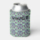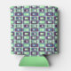 This can cooler has a mid-century modern design of rectangles stack three thick in cool colours of blues, greens, and purples on a field of white.