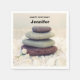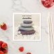 Paper napkins with a photograph featuring rocks stacks on top of each other. Surrounded by loose white rocks and little white flowers.