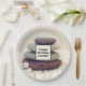 Paper plates with a photograph featuring rocks stacks on top of each other. Surrounded by loose white rocks and little white flowers.