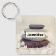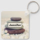 Personalised keychain with a photograph featuring rocks stacks on top of each other. Surrounded by loose white rocks and little white flowers.