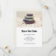 Save the date card with a photograph featuring rocks stacks on top of each other. Surrounded by loose white rocks and little white flowers.