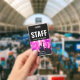 The staff name badge can be customised with your event name, date and venue information. The concert crowd photo may be used or replaced with your own photo. The QR code on back can be customised to direct to your website.