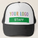 Easily personalise this staff trucker hat with your own company logo, job title, or other custom text. It's adjustable with a mesh back and a foam front. Available in other colours. Adjustable unisex style for men or women. No minimum order quantity and no setup fee.